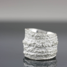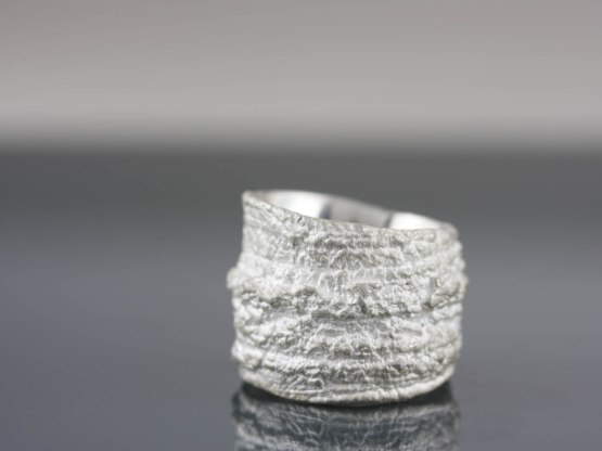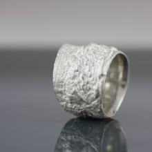 Bague en argent massif. L’intérieur très lisse et poli contraste avec l’extérieur qui est texturé.