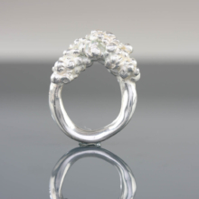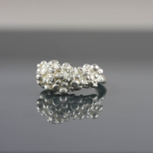Une bague en argent massif : une constellation de petites boules forment un chaton poli sur le dessus du doigt.