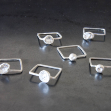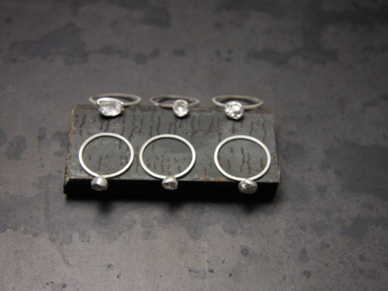 Une pépite d’argent fin toujours différente surmonte chaque bague qui peut être ronde ou carrée. Chaque bague existe en 3 tailles (SML).