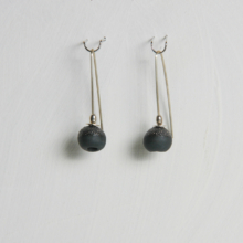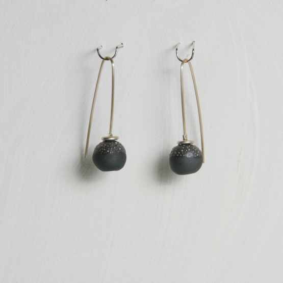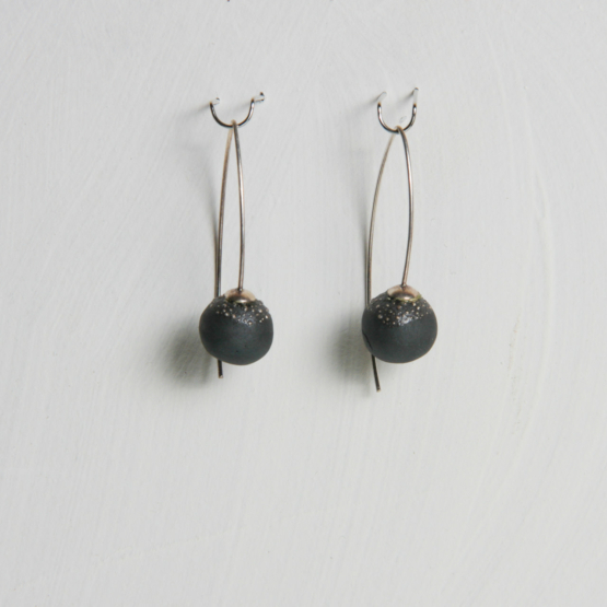 2 boules de porcelaine noire partiellement constellisées sont montées sur des tiges en argent massif.