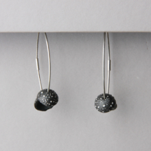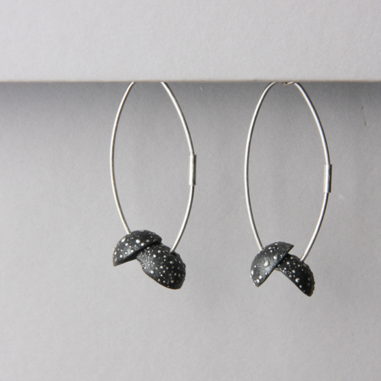 2 doubles cupules de porcelaine noire constellisée sur une face sont montés sur des anneaux en argent massif.