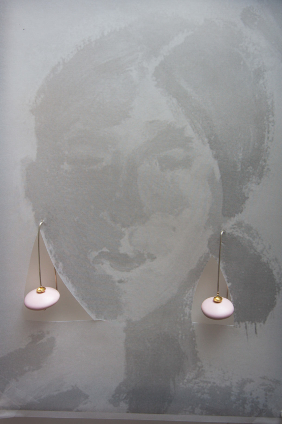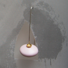une grande lentille de porcelaine émaillée rose mat est montée sur des tiges en argent massif.