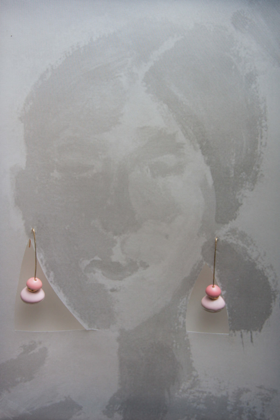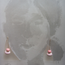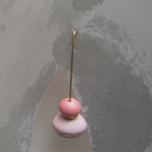 deux demi-sphères de porcelaine émaillée rose séparées par une « bouée » d’argent sont montées sur des tiges en plaqué or.