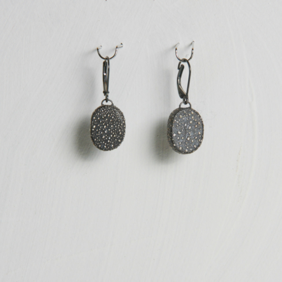 Boucles Vermeer : Galet de porcelaine constellisé avec des perles d’argent sur dormeuse en argent oxydé.