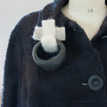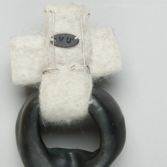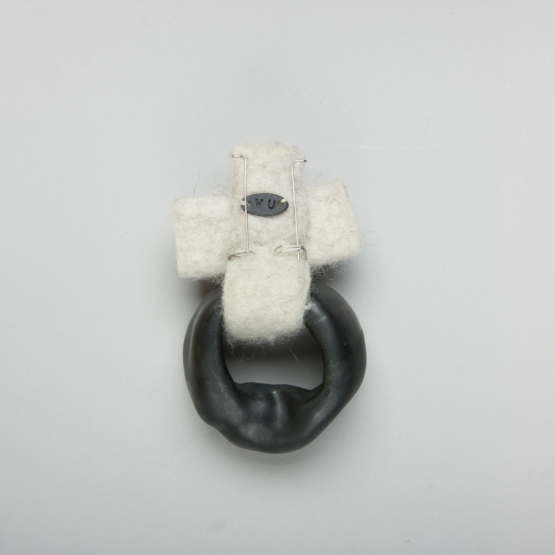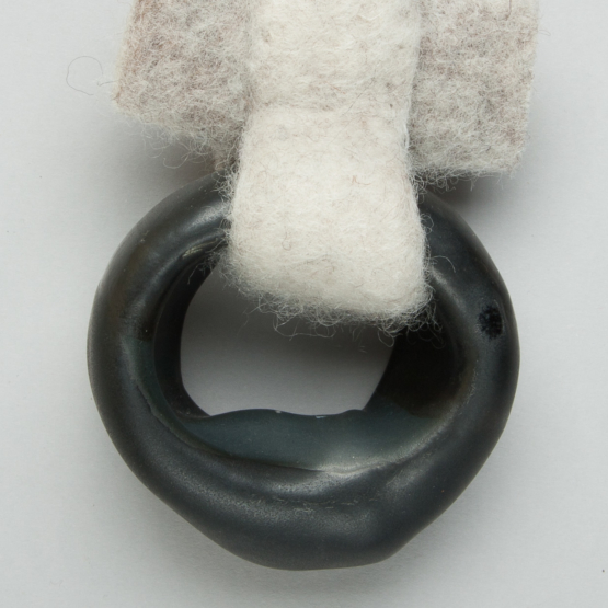 Un anneau de porcelaine émaillée, creux mais volumineux est accroché à une croix en feutre de laine ; le tout monté en broche.