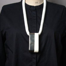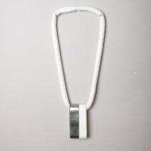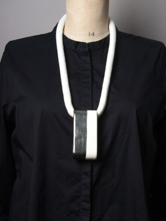 un bandeau de porcelaine émaillée et réhaussée de platine est glissée dans une corde de lin blanche.