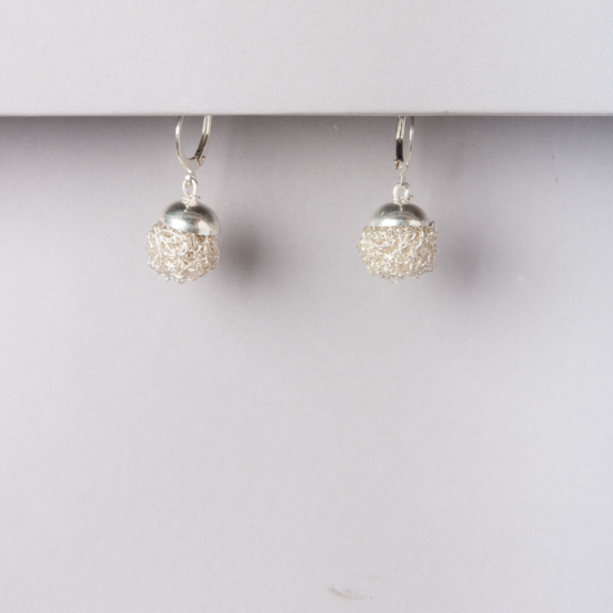 Une boule en maille d’argent est insérée dans une cupule d’argent, et montée sur une dormeuse en argent massif.