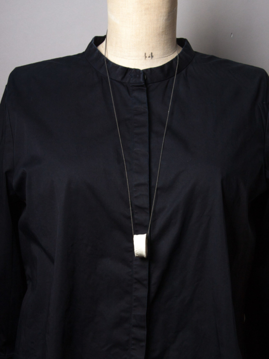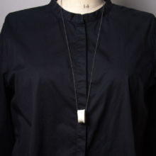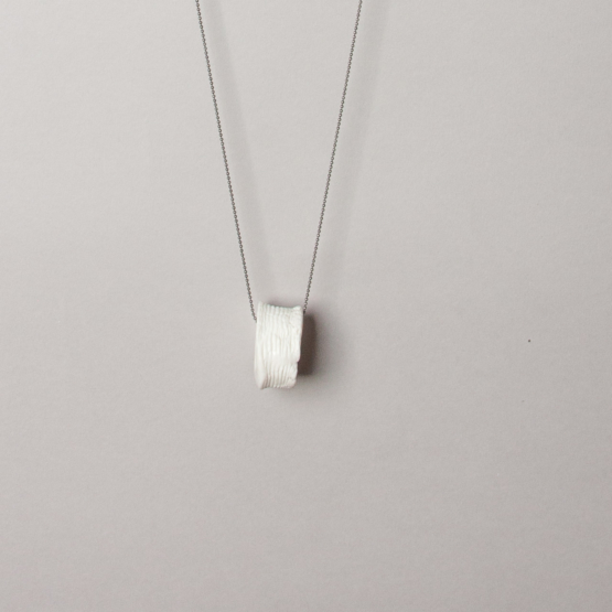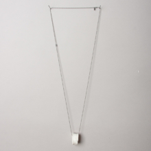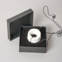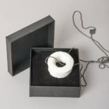 Un anneau de porcelaine blanche matiérée est monté sur une chaîne en laiton oxydé
