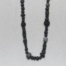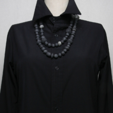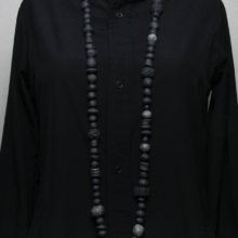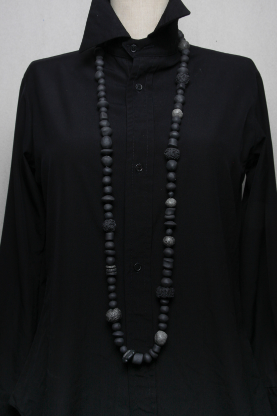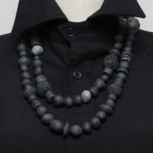 sautoir constitué de perles de porcelaine noires, travaillées avec différentes matières.